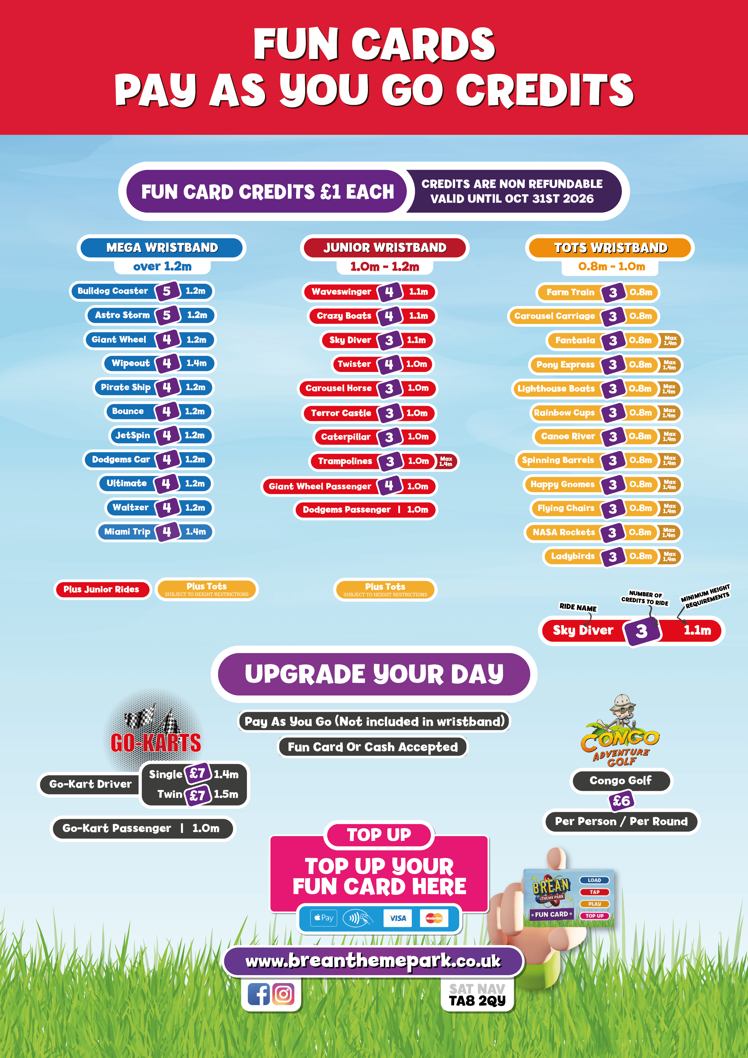 If you do not wish to purchase a Wristband but still wish to ride, Ride Credits are available at £1 each from the Pay Booths. Credits to a value of your choice will be loaded onto our new FUN CARD which can then be used to Pay as you Play with a simple tap at each ride. Each ride 'costs' from 2-6 credits per person, per ride.